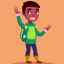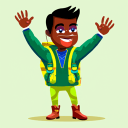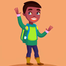 stage 1: 2D animated, warm and inviting cartoon character in soft pastel colors, flat-vector style. Ethnically neutral, gender-neutral, wearing casual outdoorsy clothes with a backpack. One hand raised in a friendly wave, light gentle smile, relaxed and welcoming posture. Green hoodie, dark blue pants, brown boots, yellow backpack. Eyes looking forward naturally. clean smooth lines, minimal brush strokes, subtle shading, harmonious warm tones, cozy and playful feel, crisp edges, polished and simple, transparent background, full body, centered, game-ready style for animation sprites.